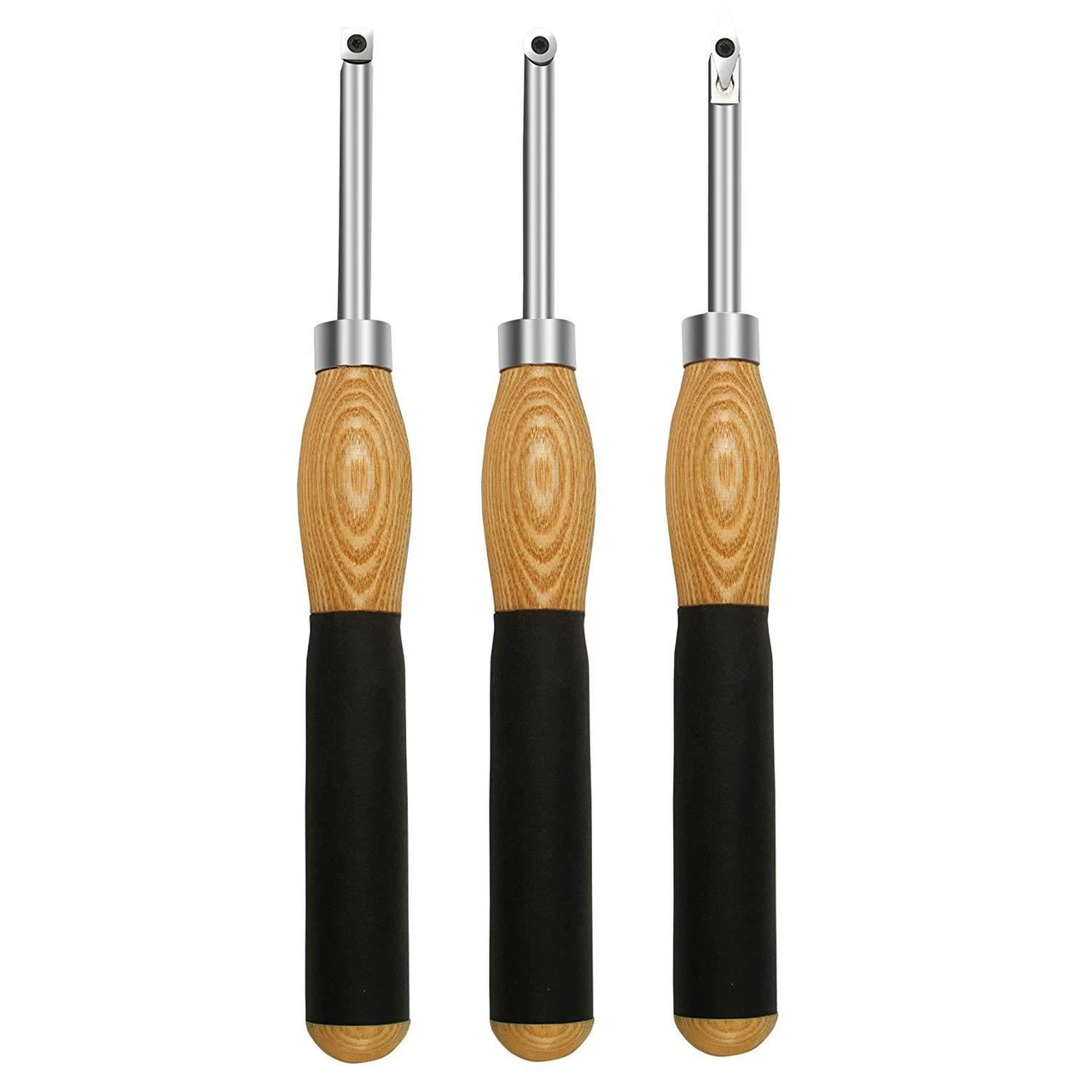 If you love woodturning but hate sharpening our mini turning tool set with carbide inserts is perfect for you. These tools eliminate the need for sharpening by using rotatable and replaceable carbide inserts mounted to steel shafts. When the edge of the cutter finally gets dull, simply rotate to a new edge and replace with a new insert when all edges are dull. Carbide cutters stay sharper for longer when compared to steel. The ergonomic handles are turned from solid Ash with a moulded rubber grip for a comfort and reducing fatigue.