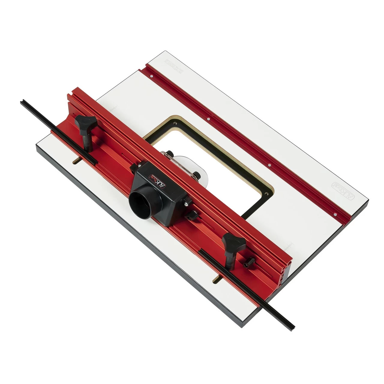 Our AUKTools Router Table and Fence Package features a HPL (High-Pressure Laminate) table top, made for us in the UK to our exacting standards. The low friction, hard-wearing phenolic laminated surface and balancer are bonded to a green moisture resistant MDF core, renowned for its stability and longevity in damp conditions. Set into the table top is a 3/4” wide (19mm) aluminium mitre track red anodised for a hard-wearing low friction glide for accessories such as feather boards or a mitre gauge.