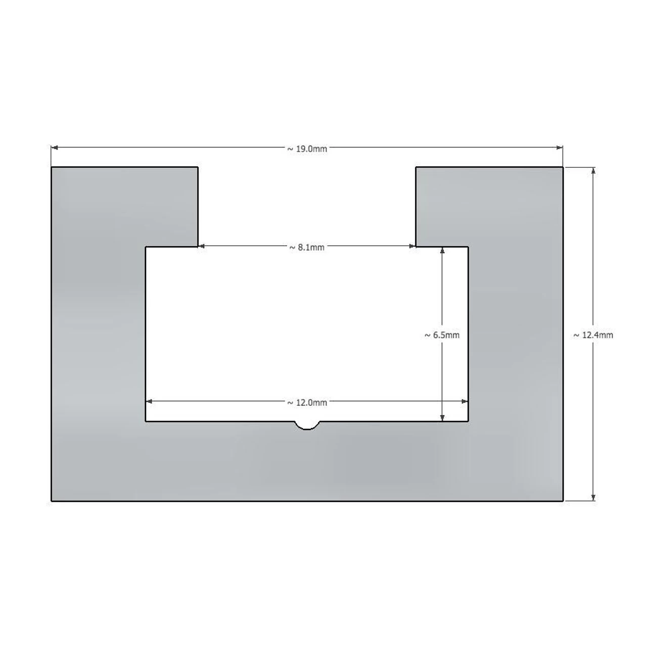 - External measurements approx 19mm (3/4″) wide x 12.4mm (1/2″) deep