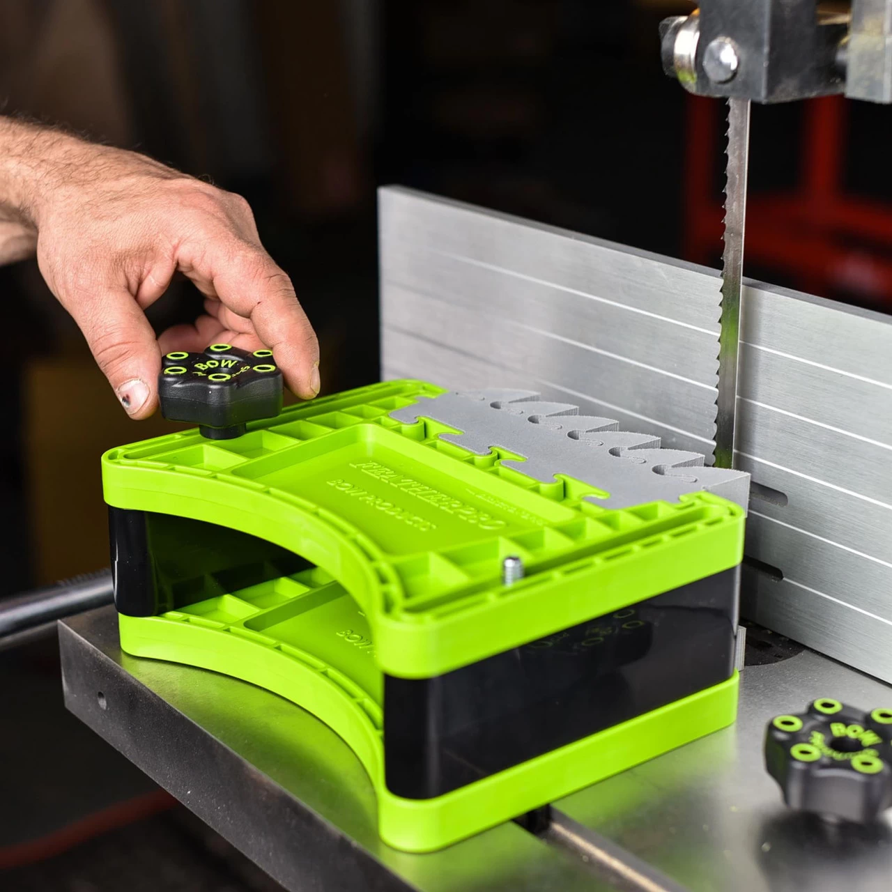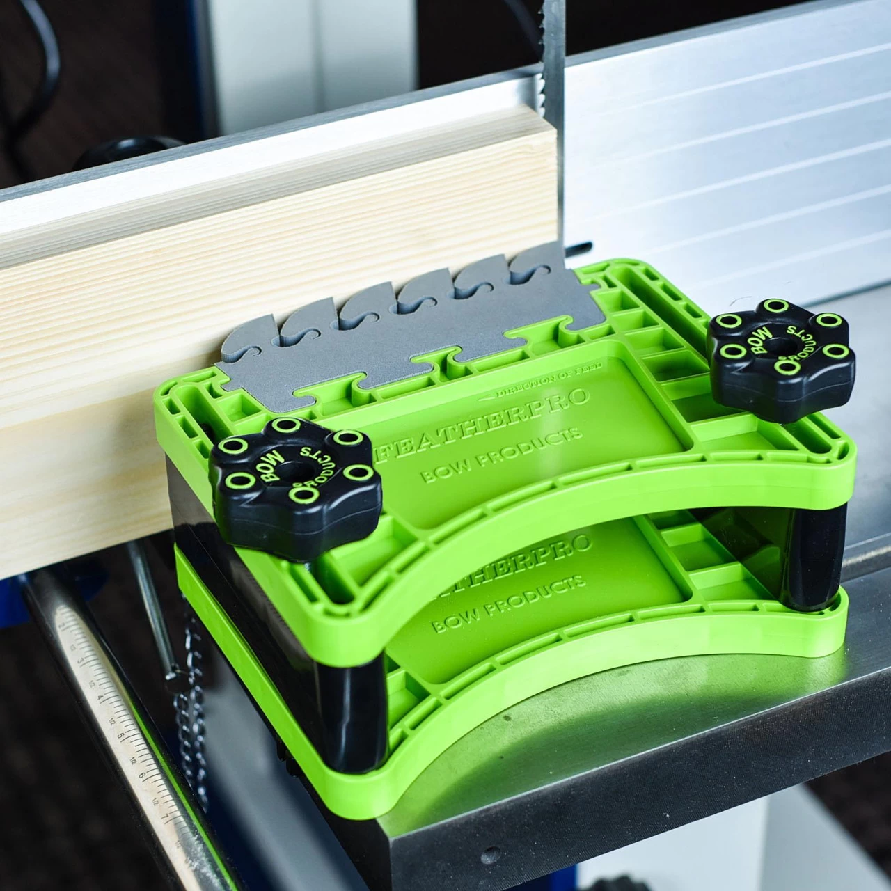 The FeatherDUO is ideal for taller material feeds, when stacked, it is approximately 89mm tall making it ideal for feeding taller material through the table saw, bandsaw or the router table. The standard feathers are strong and incredibly durable. The hinge design of the feathers provides unmatched protection against kickback. Made from EVA foam, the feathers will not harm carbide cutting tips in the event of an accident. The main body is a high-grade polymer moulding and includes a standard 19.1mm (3/4″) mitre slot bar that fits in a lot of table saws or router tables.