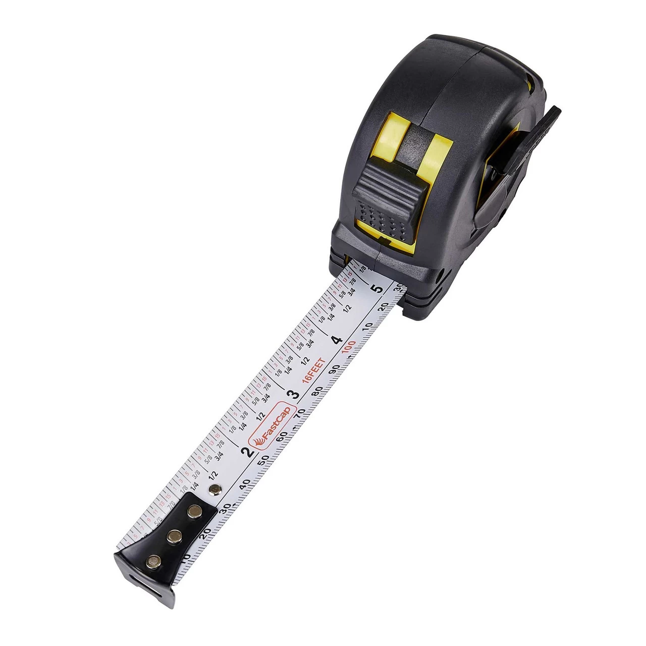 FastCap ProCarpenter Tape Measures are developed with 7 innovative features: lever action belt clip, pencil sharpener, dual locking system, erasable notepad, heavy-duty 25mm (1″) wide blade, high-contrast tape and rugged compact design. Tape measures 16 foot in length (~5m)