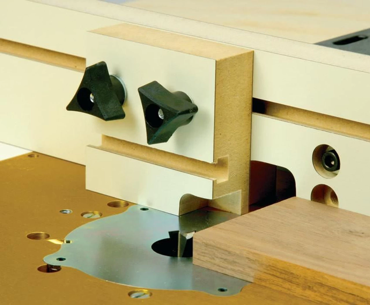 The double-laminated stop is use to limit the length of cuts such as the pin cuts on dovetails or stopped grooves for fully-trapped drawer and box bottom panels and is attached to the fence with quick-action knobs. It’s even reversible to offer a choice of stop surfaces, and it even features its own T-slot for adding other fixtures.