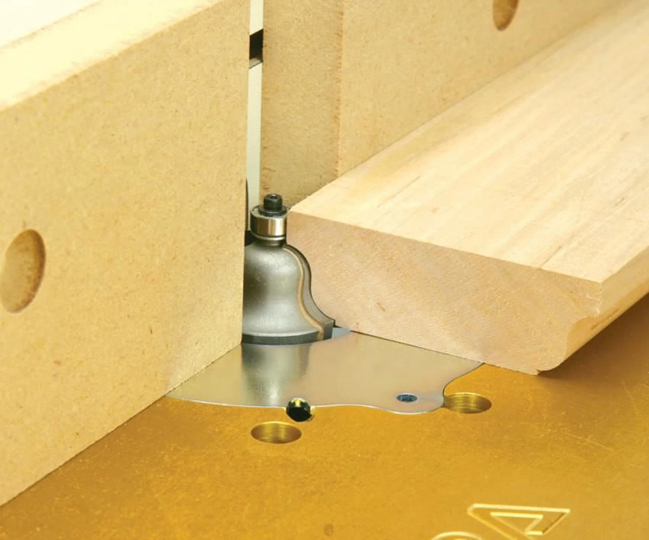 The aluminium right angle features a 6.75”-wide face plate with plenty of T-slots for adding backing boards or other fixtures for specialised work. The wooden runners are replaceable and gentle on your router bits in the event of accidental contact.