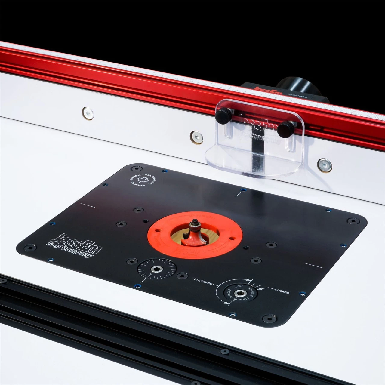 The 9.5mm thick cast, precision ground and anodised black solid aluminium top plate is very strong and flat and will not flex or bend in use. The plate measures 235mm x 298mm and will accommodate large diameter cutters up to 92mm and can be reduced down to 51mm using the glass filled poly-carbonate insert ring (ring included – other ring sets are available). All Jessem plates come with their own levelling system allowing for perfect alignment and levelling and fit our own JessEm and INCRA table tops or use our router insert plate template for home-made tables, for a perfect fit.