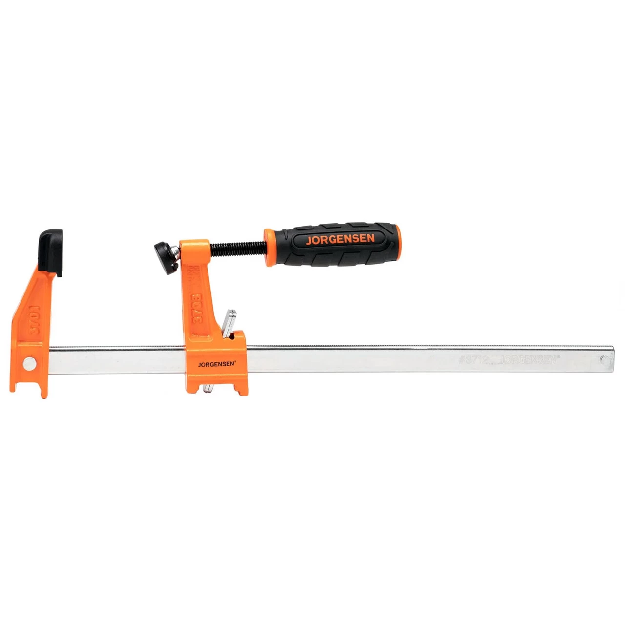 The Jorgensen steel bar clamps are seriously strong. Cast-iron stationary and sliding heads finished in an orange powder coat are complimented with a high-carbon, rust-resistant steel bar. The fast-acting sliding head is acme threaded to accommodate a cold-drawn steel screw with a large easy-grip handle and swivel pad. The original multiple-disc-clutch design allows the sliding head to hold securely at any point along the bar.