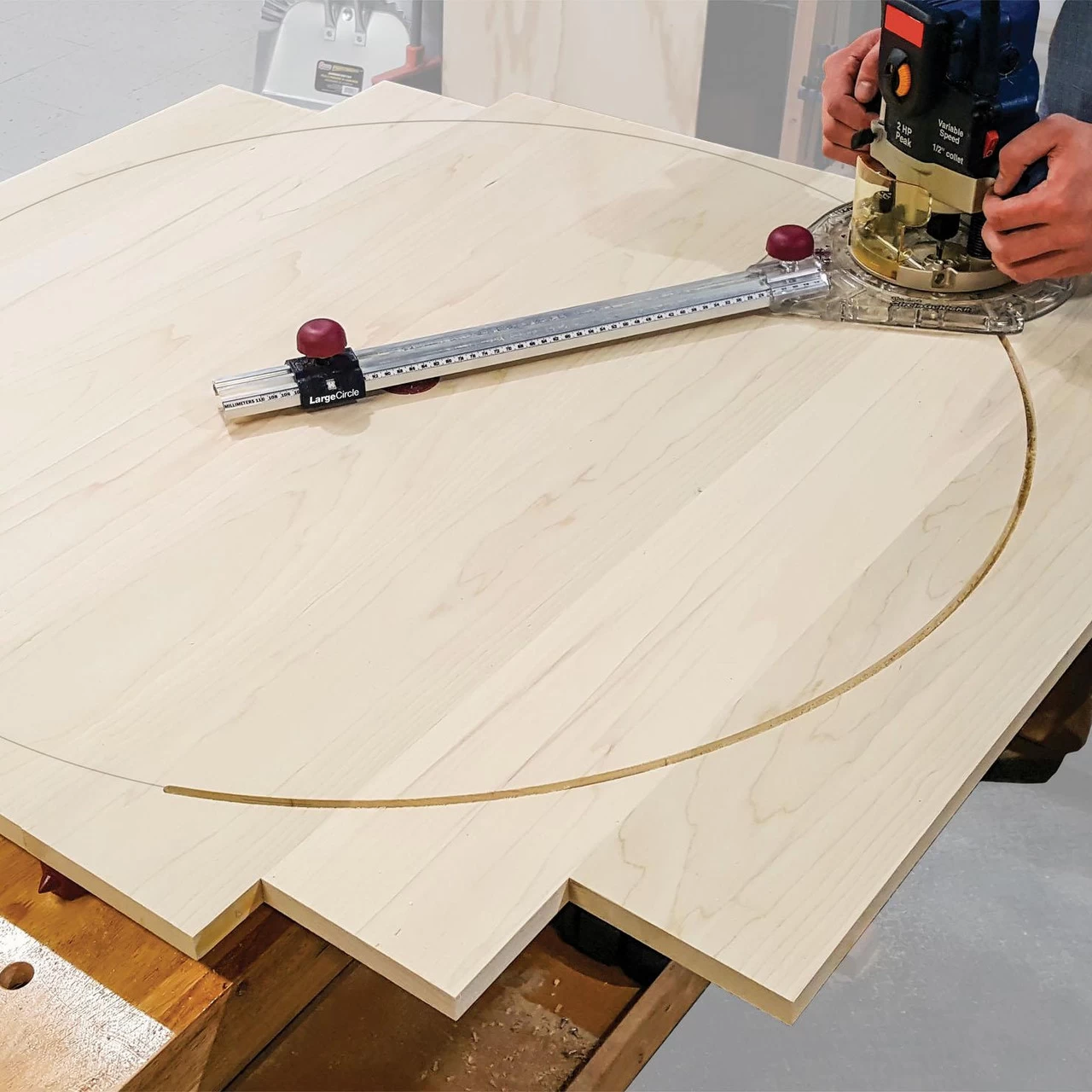 The CircleGuideKit™ includes everything needed to cut circles 1-1/2” (38mm) to 52” (1320mm) in diameter. The included TurnLock™ base plate is compatible with most routers and allows for quick jig setup. This router guide also includes a bonus Offset Base for finishing edges on your workpiece. Use a plunge router for best results.