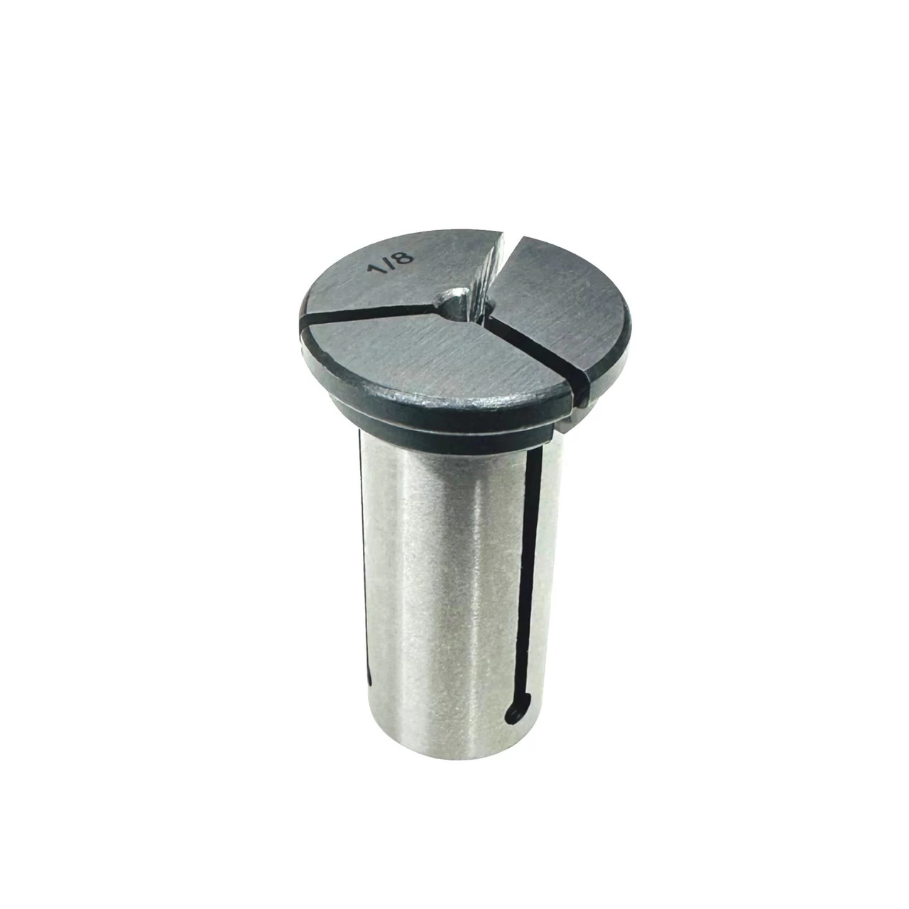 The Musclechuck Router Collet Reduction Sleeve is a universal split-type steel bushing that allows you to use 1/8″ shank router bits in 1/2″ collets.