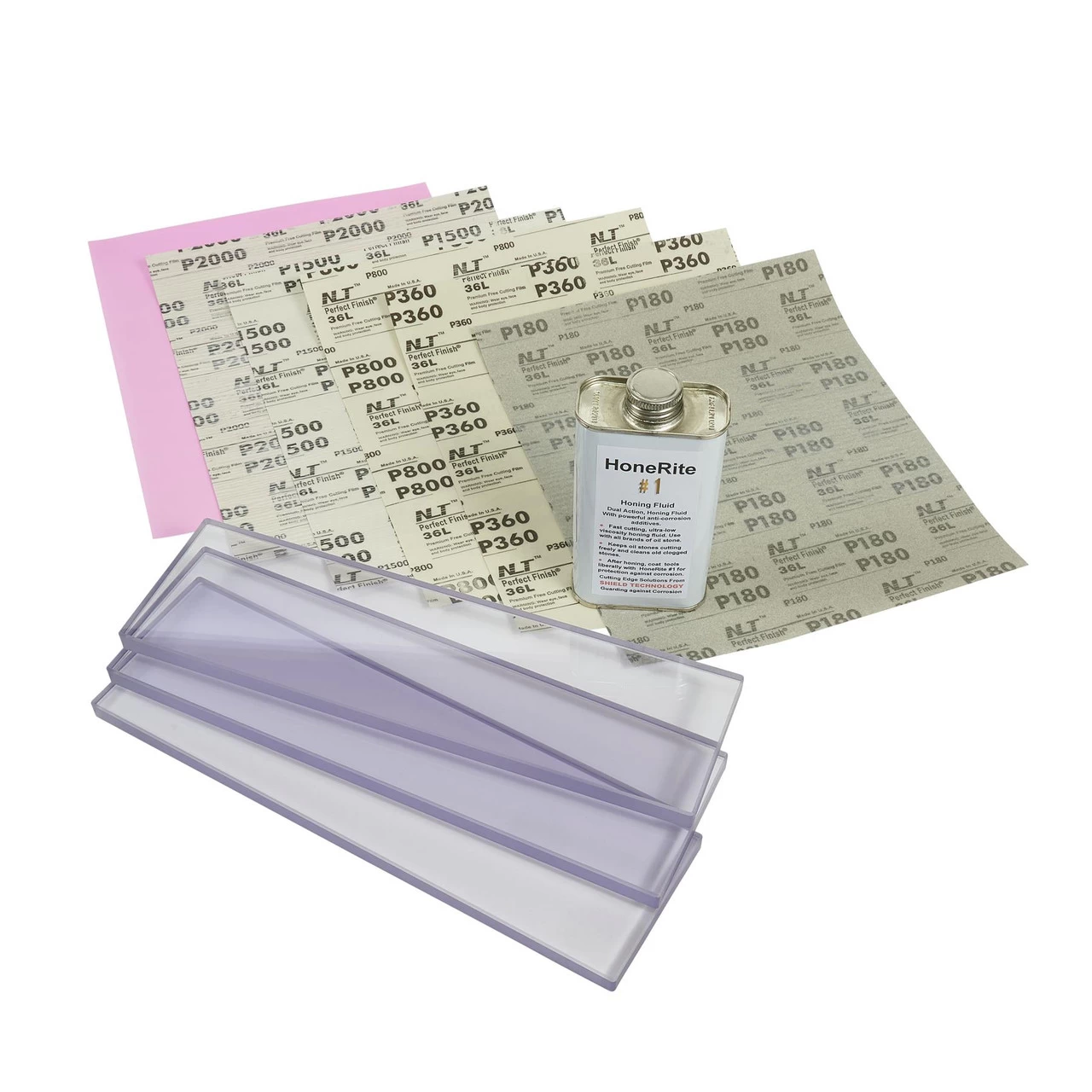 Our standard set contains our Scary Sharpening Polycarbonate Plates, Shield Technology HoneRite No 1 and Scary Sharpening Abrasive Papers.