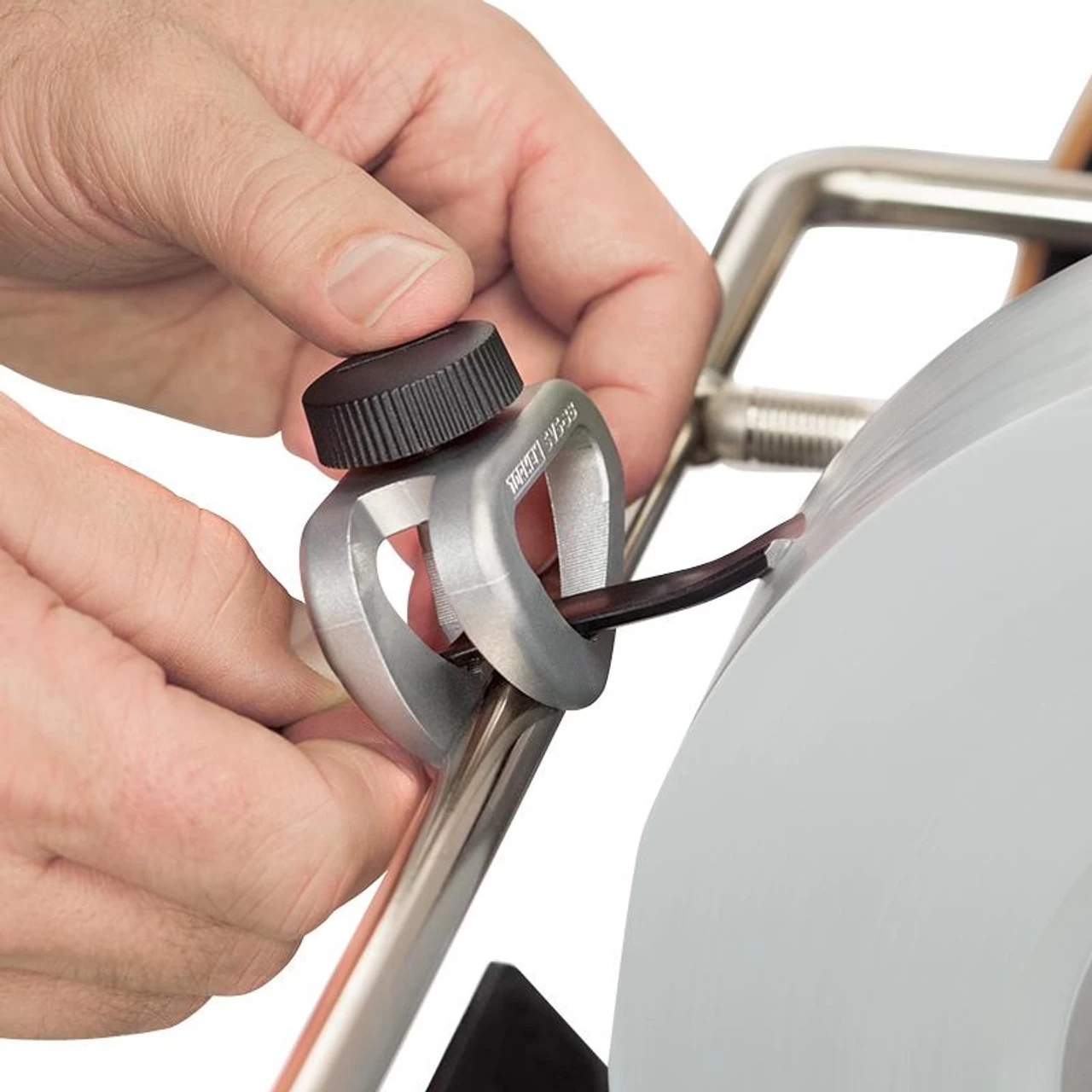This is a great advantage, as you can continuously concentrate on how the edge touches the grindstone or the honing wheel without having to worry whether the jig is square to the stone.