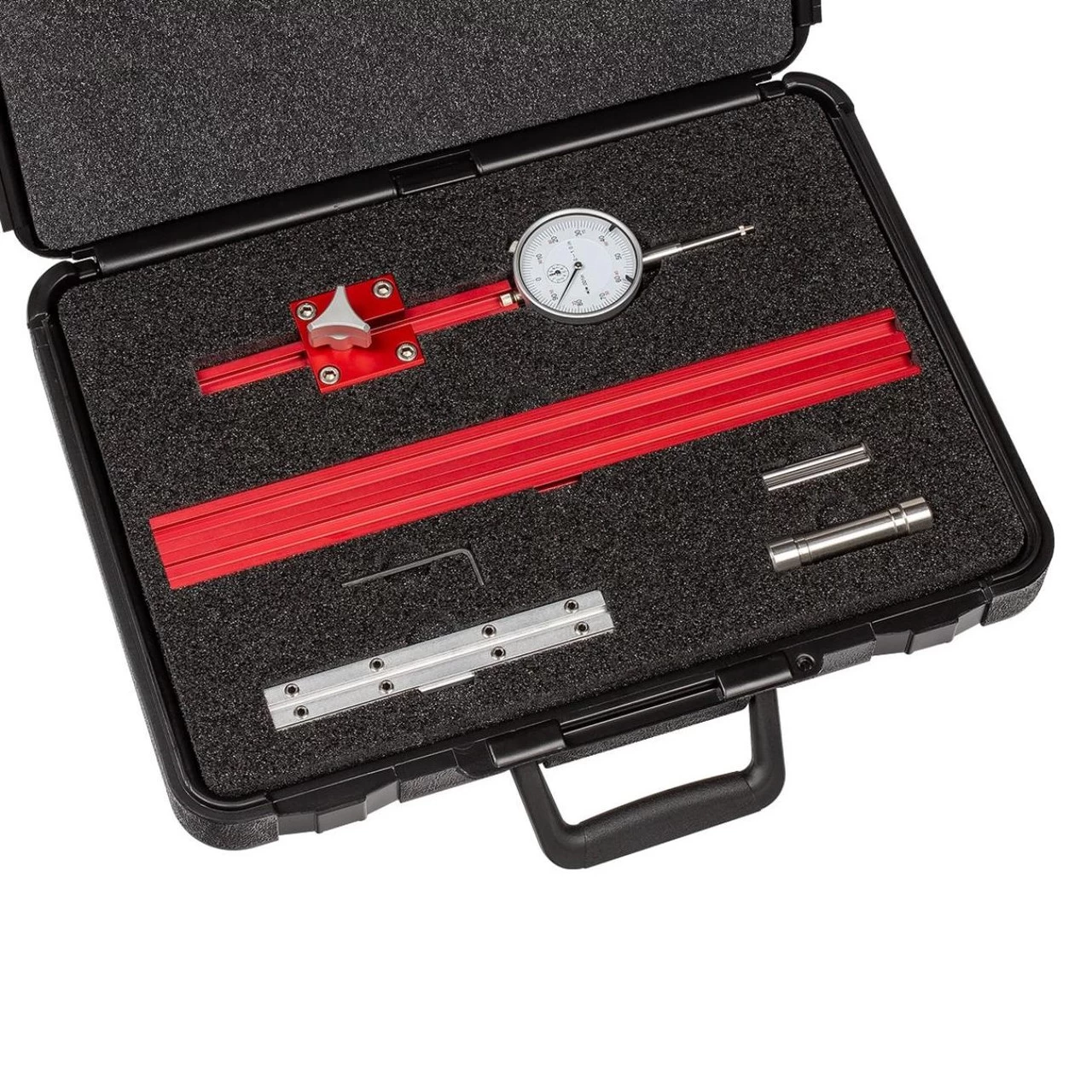 Drop the pins in the mitre slot, adjust the arm on the gauge so the dial indicator just kisses the saw blade and check it at the front and back of the blade. It’s that easy.